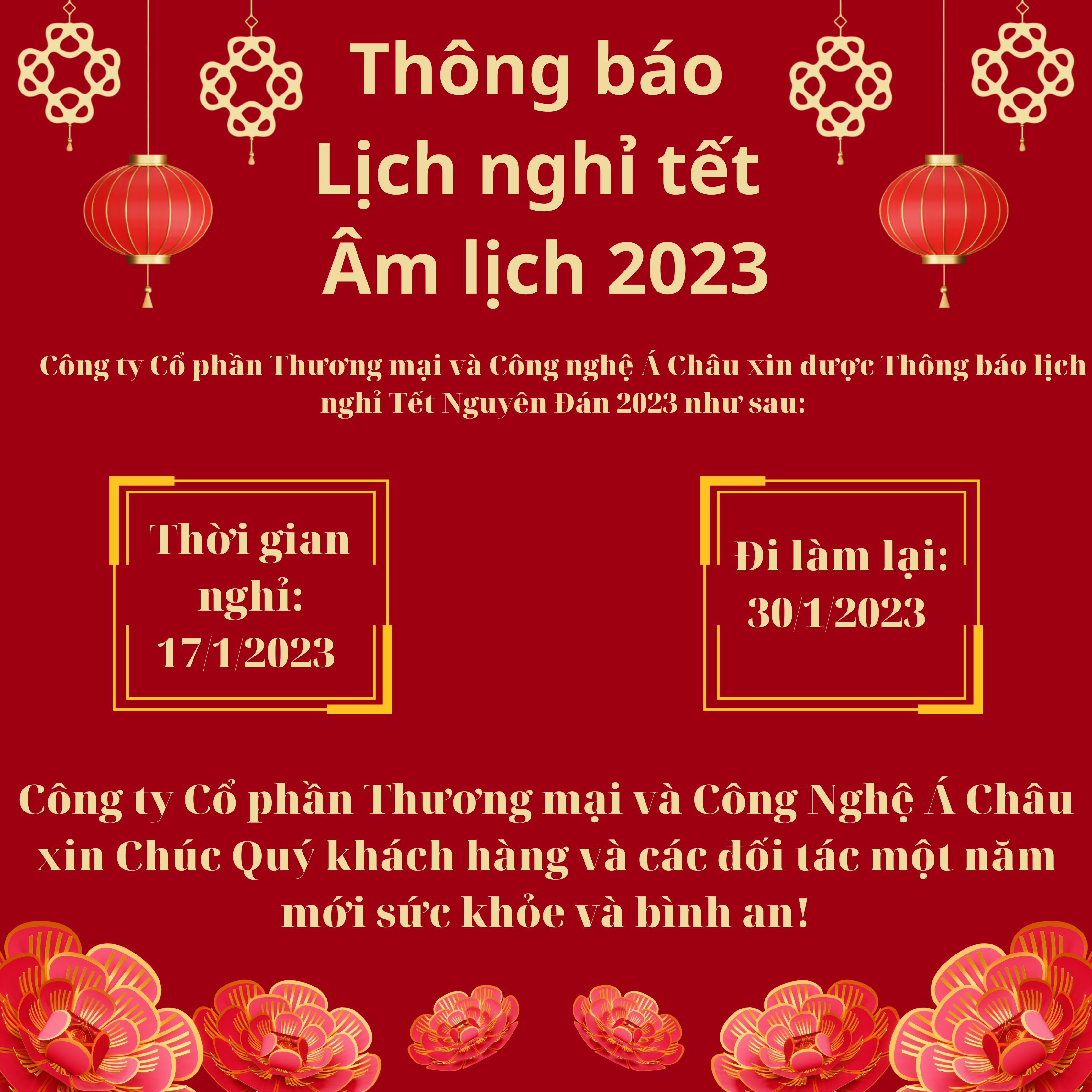 Công ty Cổ phần Thương mại và Công Nghệ Á Châu xin Thông báo tới Quý khách hàng và các đối tác Lịch Nghỉ Tết Nguyên Đán 2023 như sau:
